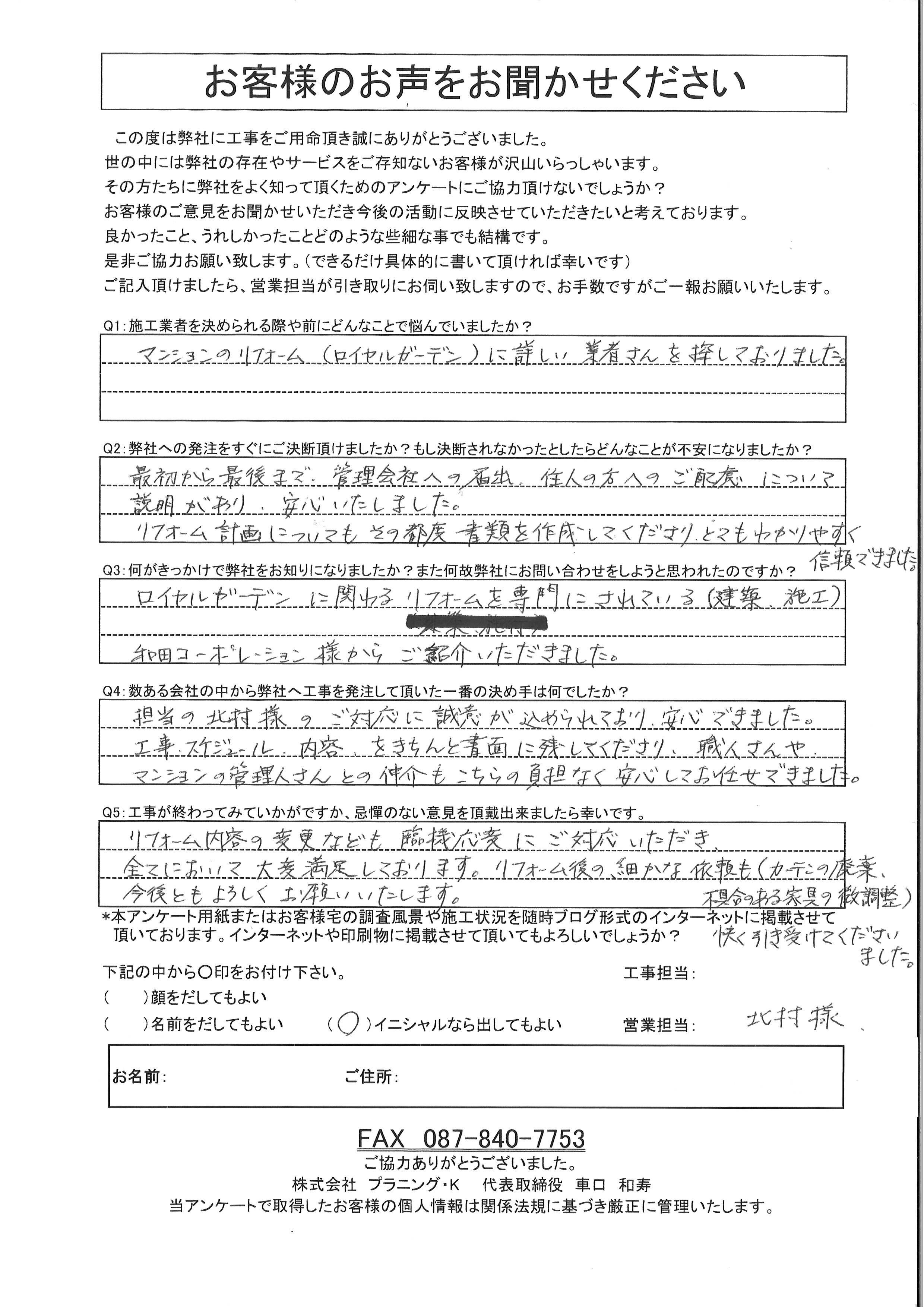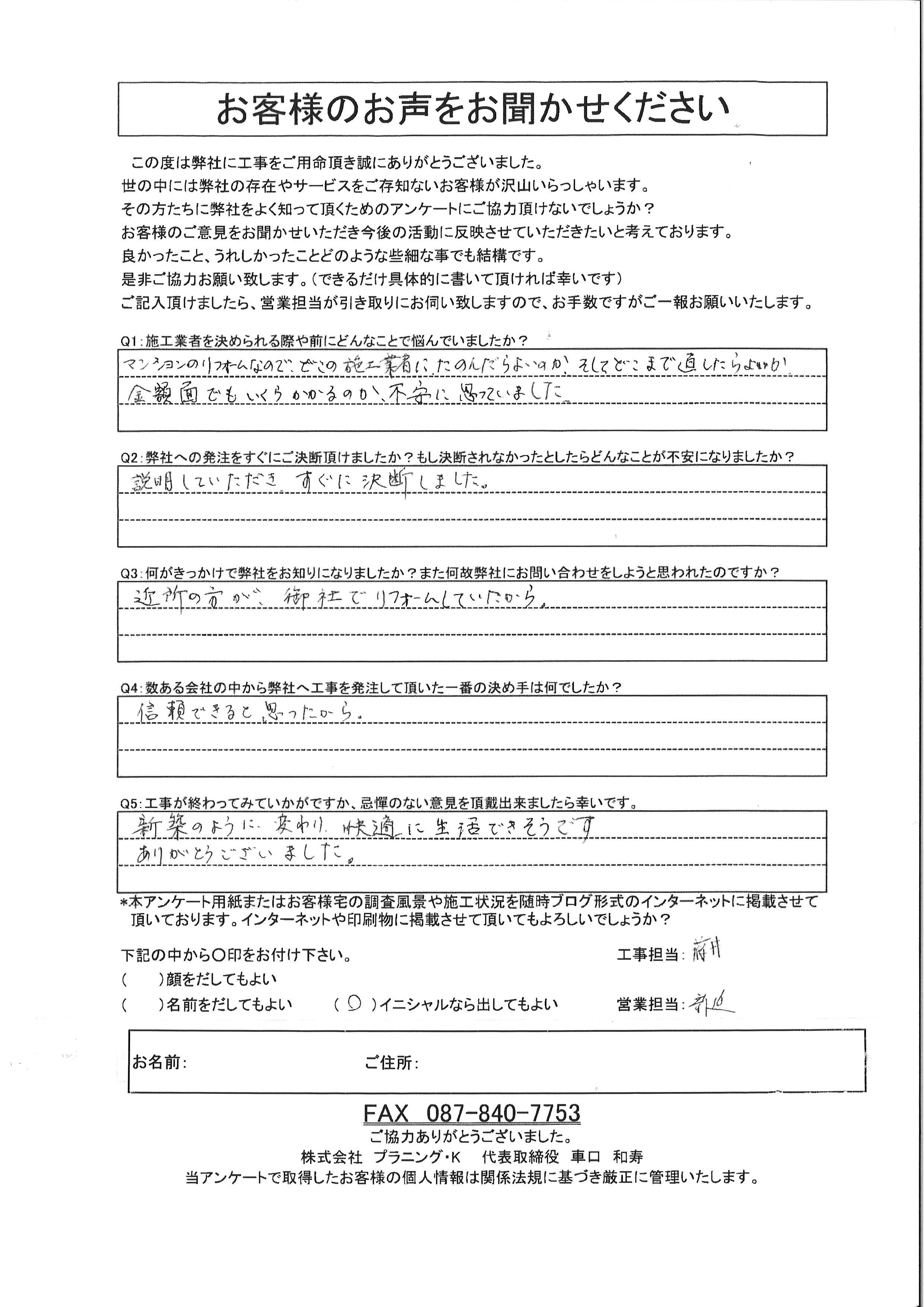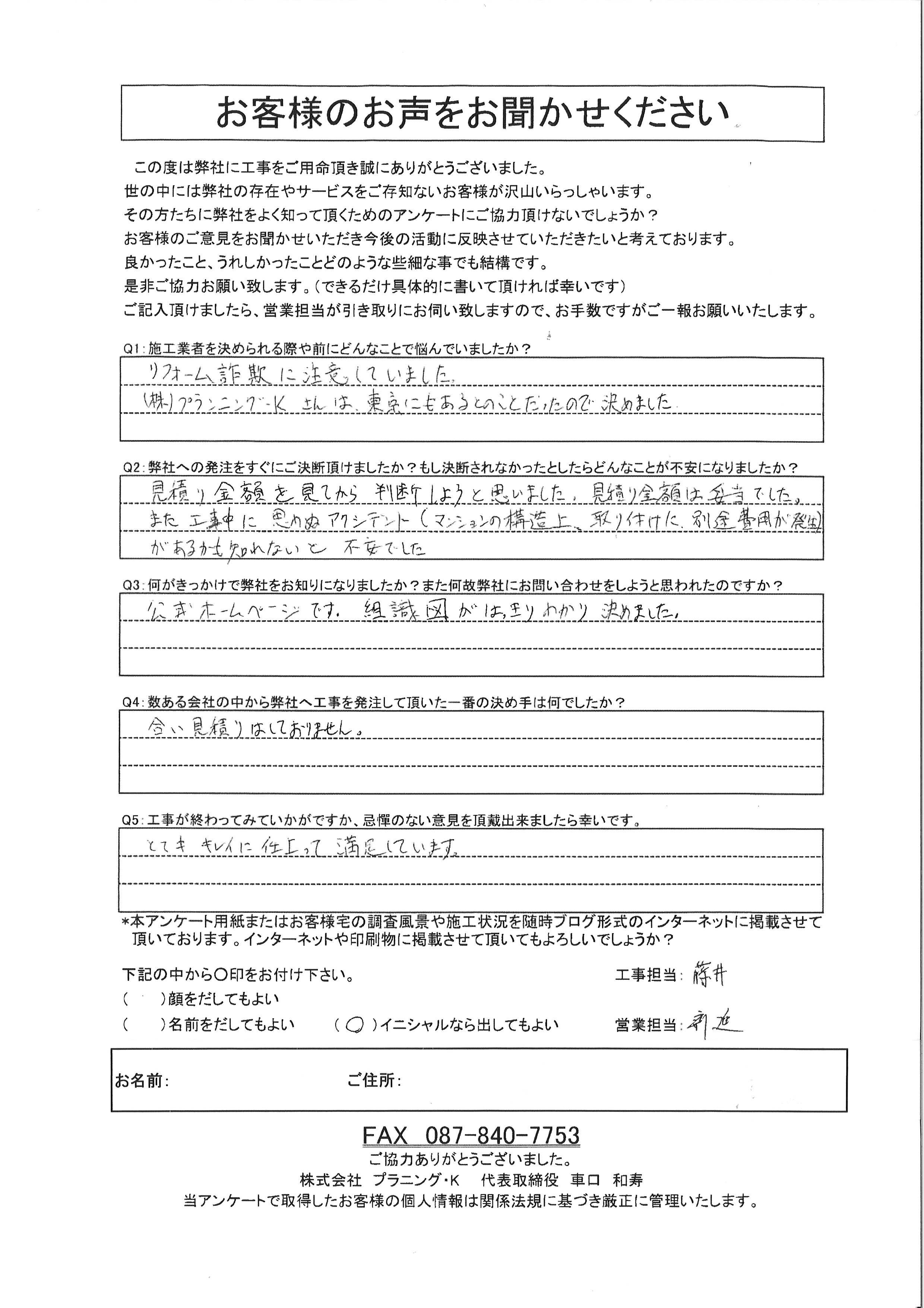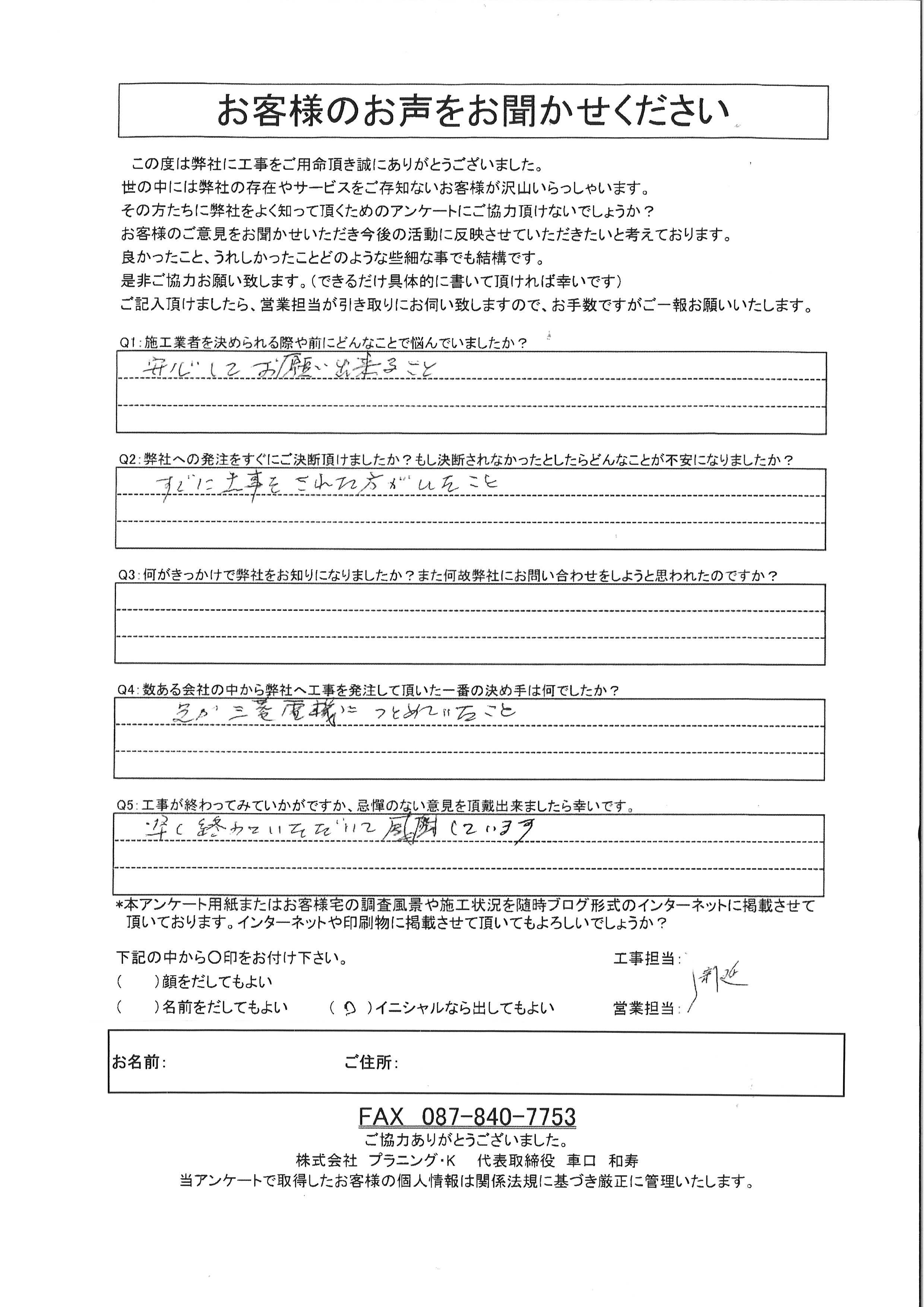 親切丁寧で、かつ率直なアドバイスをしてくださり、見積りも非常にリーズナブルで良心的であり決めました。